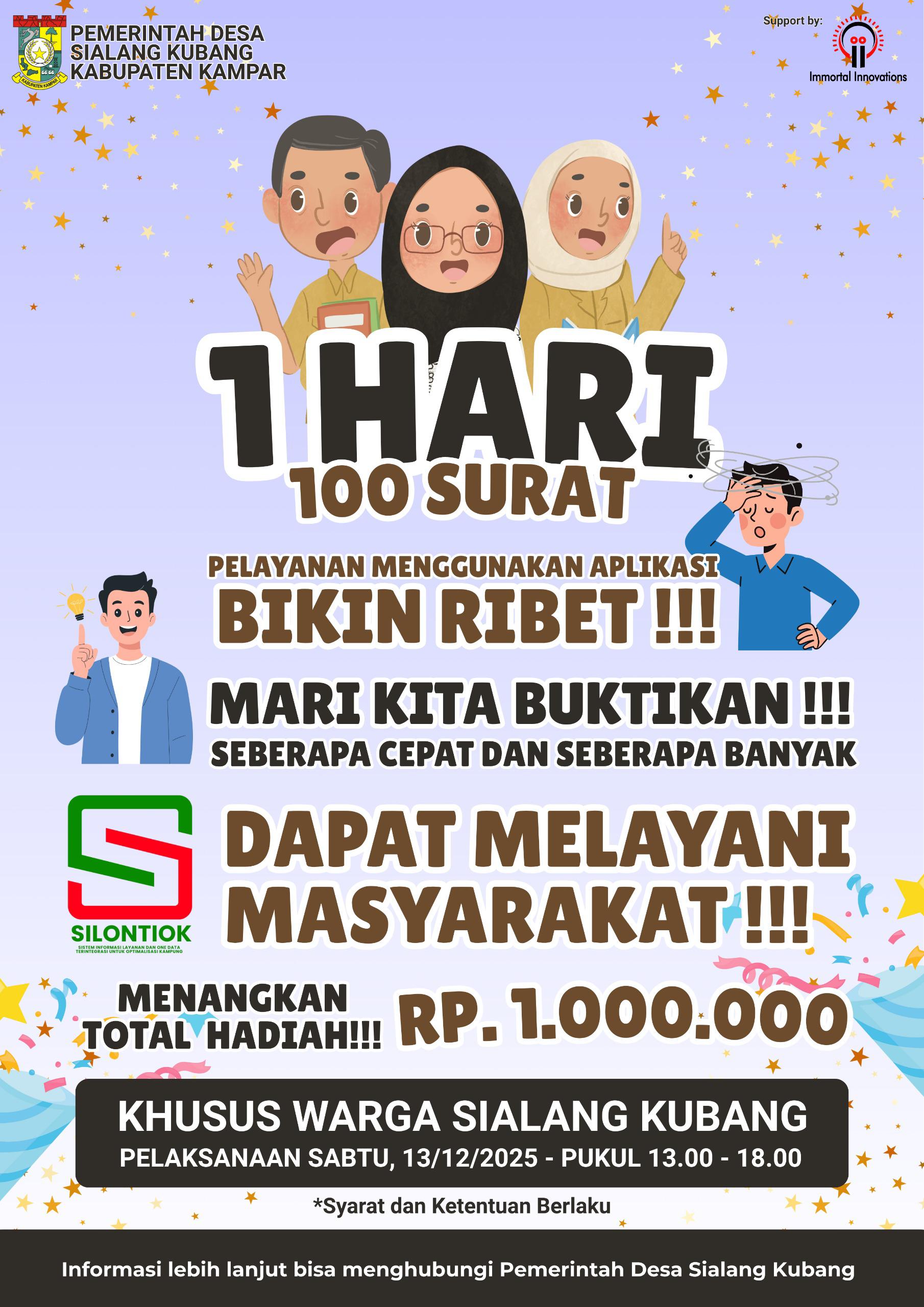‎Komitmen tersebut dibuktikan melalui pelaksanaan Challenge “1 Hari 100 Surat” yang digelar pada Sabtu, 13 Desember 2025, mulai pukul 12.00 hingga 18.00 WIB. Kegiatan ini bertujuan untuk menguji sekaligus membuktikan kepada masyarakat bahwa pelayanan administrasi desa berbasis aplikasi dapat berjalan cepat, efektif, dan mudah diakses oleh warga.
